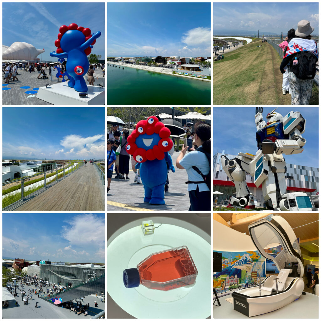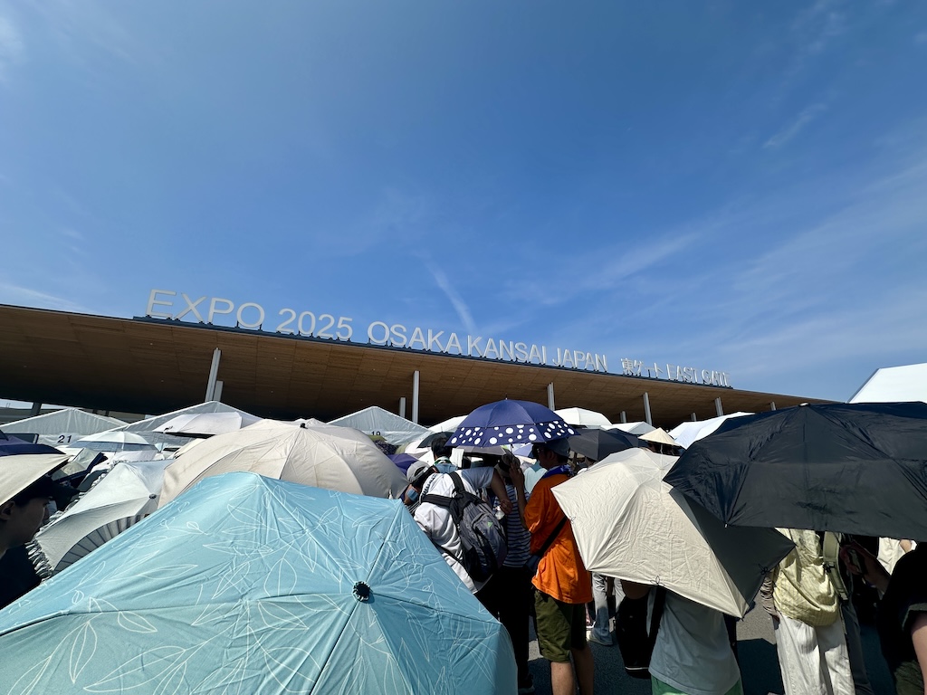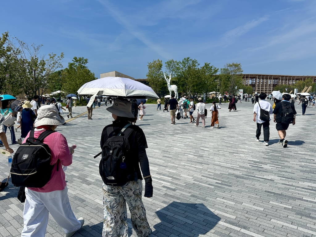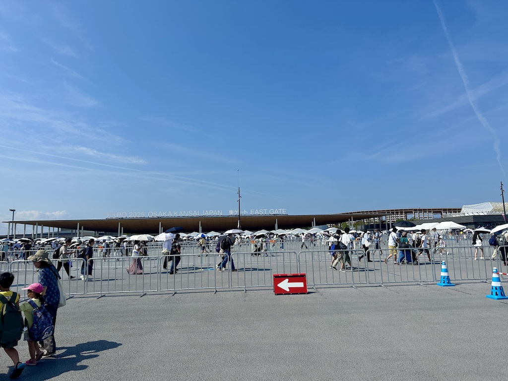 万博会場最寄りの地下鉄中央線舞洲駅で9時30分に集合し、いざ出陣。駅前はかなり広いので、想像していたよりは混雑していませんでした。ここ数日は晴れ男に頼らずとも連日快晴で猛暑が続いていました。
