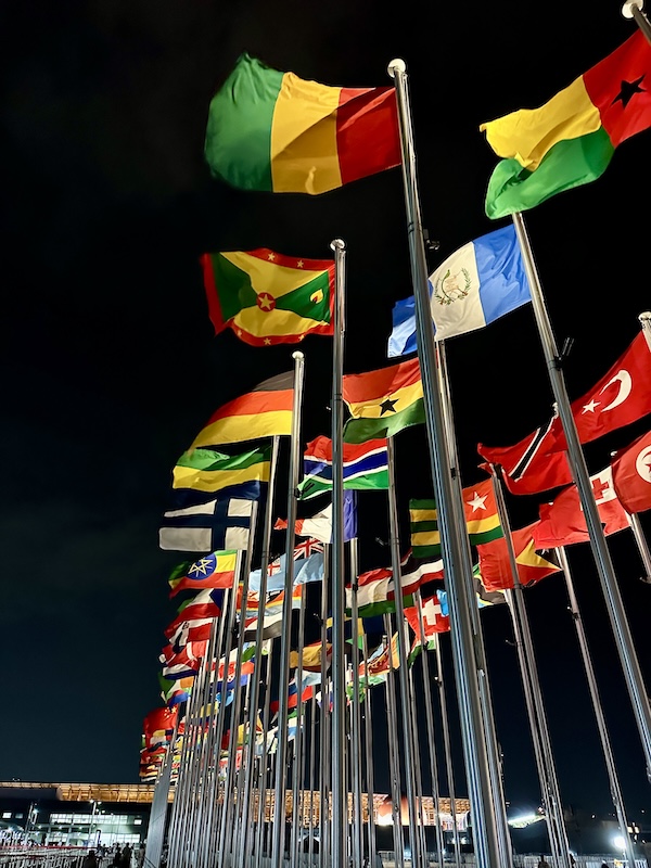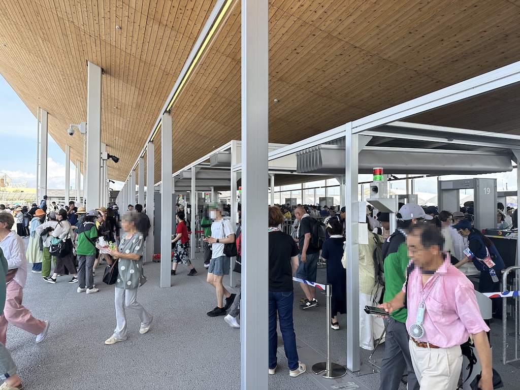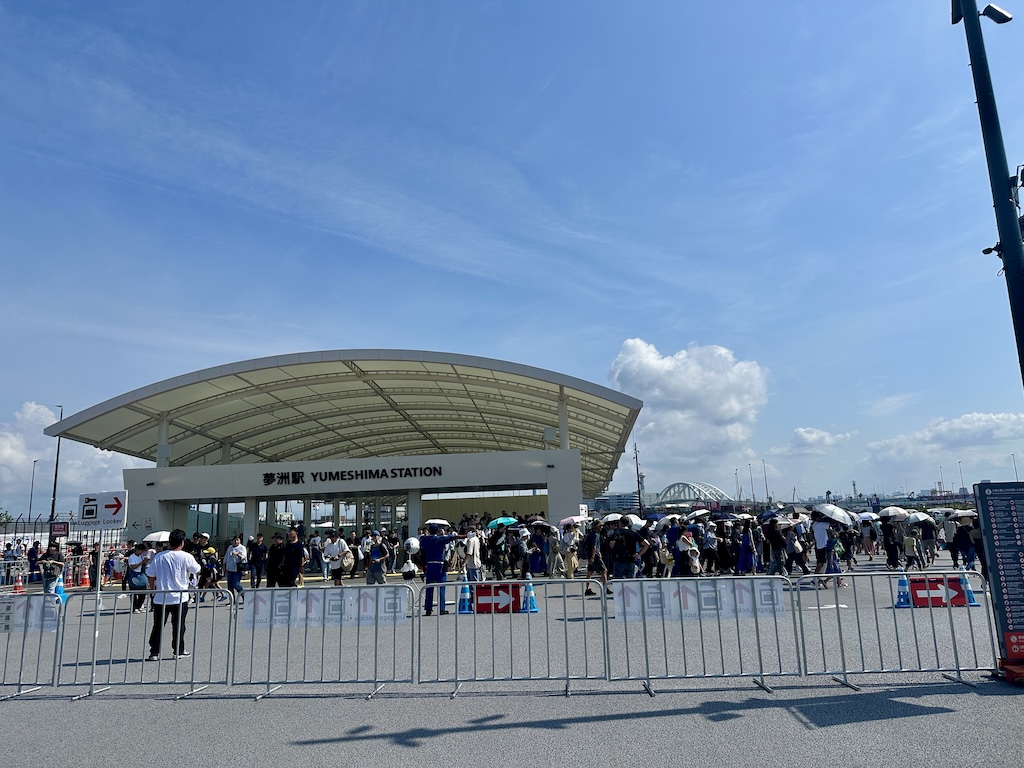 そして、入場門の東ゲートへ。ゲート手前に着くまでは結構空いてると思ったのですが、ここで空港のゲート並みに手荷物検査があり約40分並んで、ようやく入場できました。それにしても、ワタシ達も含めて老若男女問わずみなさん日傘で暑さ対策。生まれて初めて日傘の有り難みが実感できました。