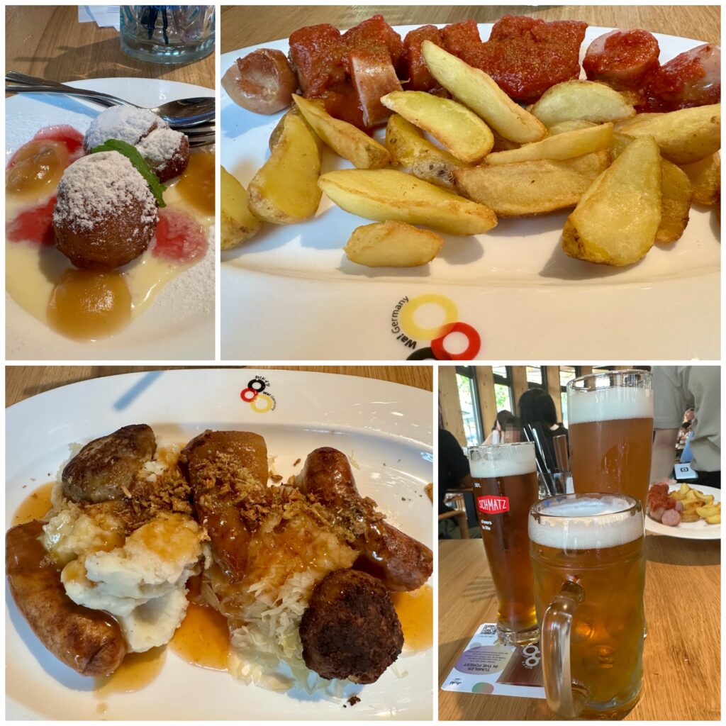 30分待ちと言われて並んでから45分後にようやく入店。ビールはホフブロイの生ビール。香りがよく食事に合うビールでした。三人でシェアした食事は、カレー風味のソーセージとジャーマンポテト、焼きソーセージ・ハンバーグ・豚のすね肉・ザワークラウト・マッシュポテトのセットメニューです。デザートは「バニラクワークボール」。フレッシュチーズを使ったドーナツ生地を揚げ、バニラ風味の砂糖をまぶしたドイツの伝統菓子だそうです。いずれも日本人の口に合わせているのか、食べやすくて美味しいので満足しました(ただし価格以外ね😅)