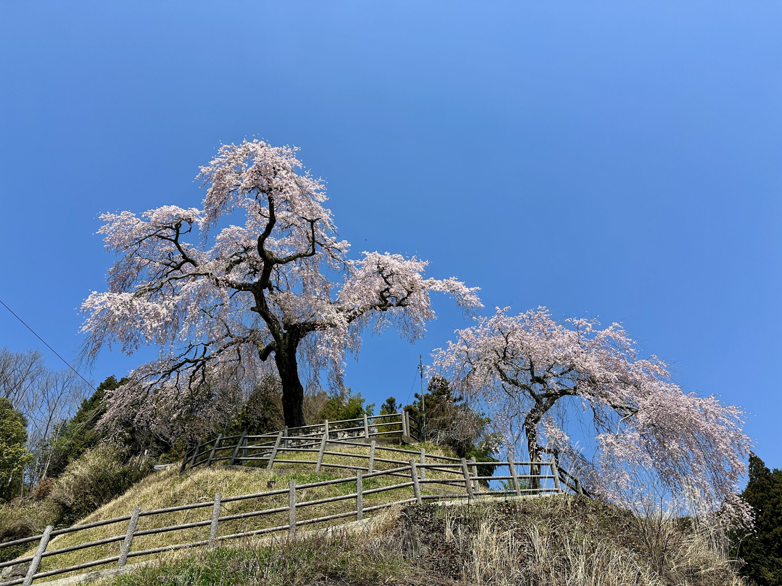 ワタシのお気に入り「極楽桜」です。去年まであまり目立たなかったのですが、隣の少し若い桜も大きくなってきており「極楽姉妹」の様相です。小高い丘にそよそよと吹く風に揺られて、この日も気持ち良さげに枝を靡かせていました。