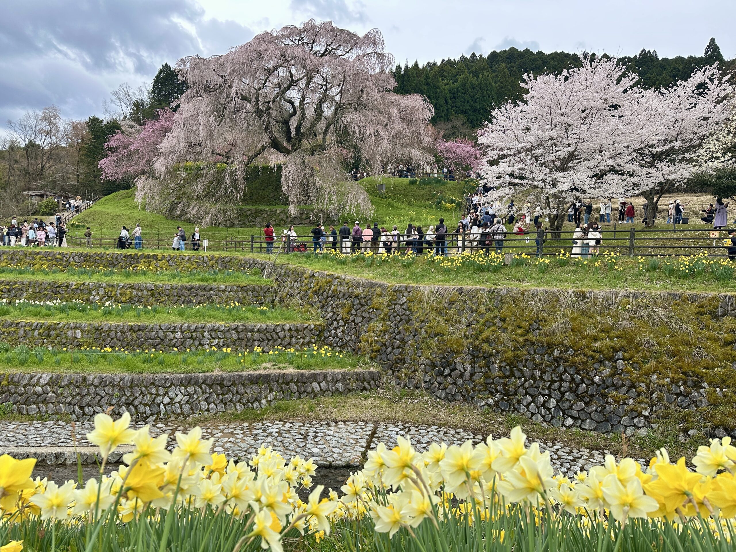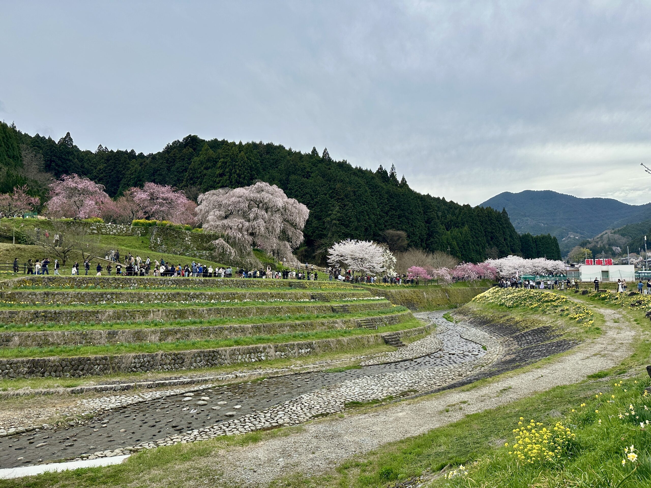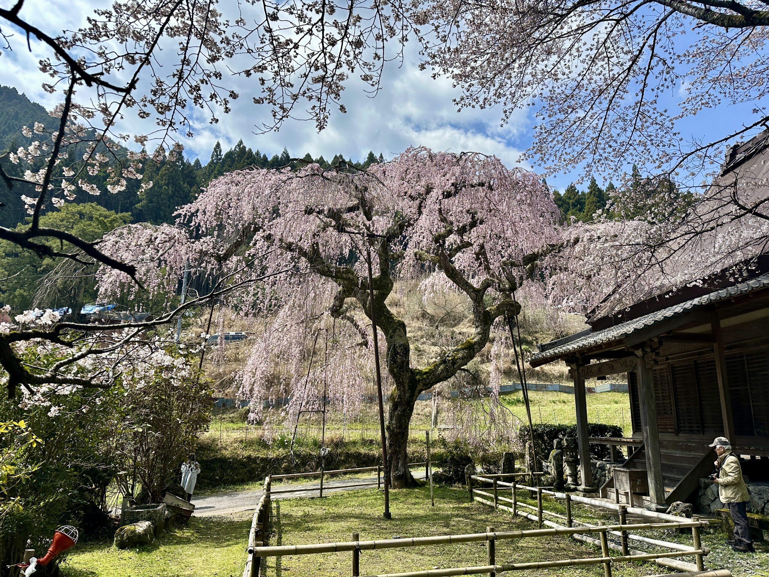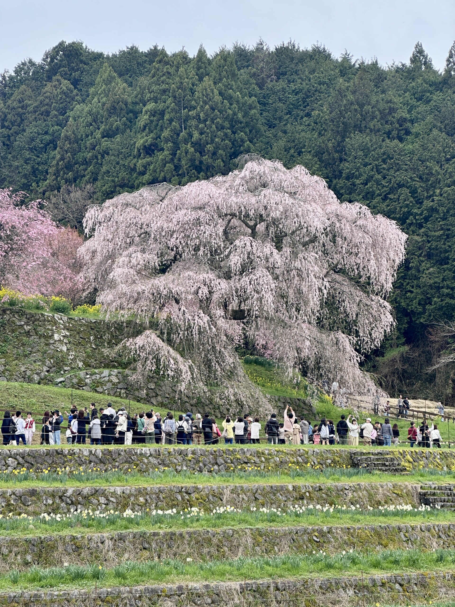 ガイドツアー当日の又兵衛桜です。ツアーではこちらを終着点としました。前日の雨で残念ながら見頃は少し過ぎてしまっていましたが、テレビやSNSで情報が拡散されるため益々人気が高まり、周辺道路は大渋滞でした。この日に車で出かけた人は、駐車場への入場待ちが2時間だったとか。。