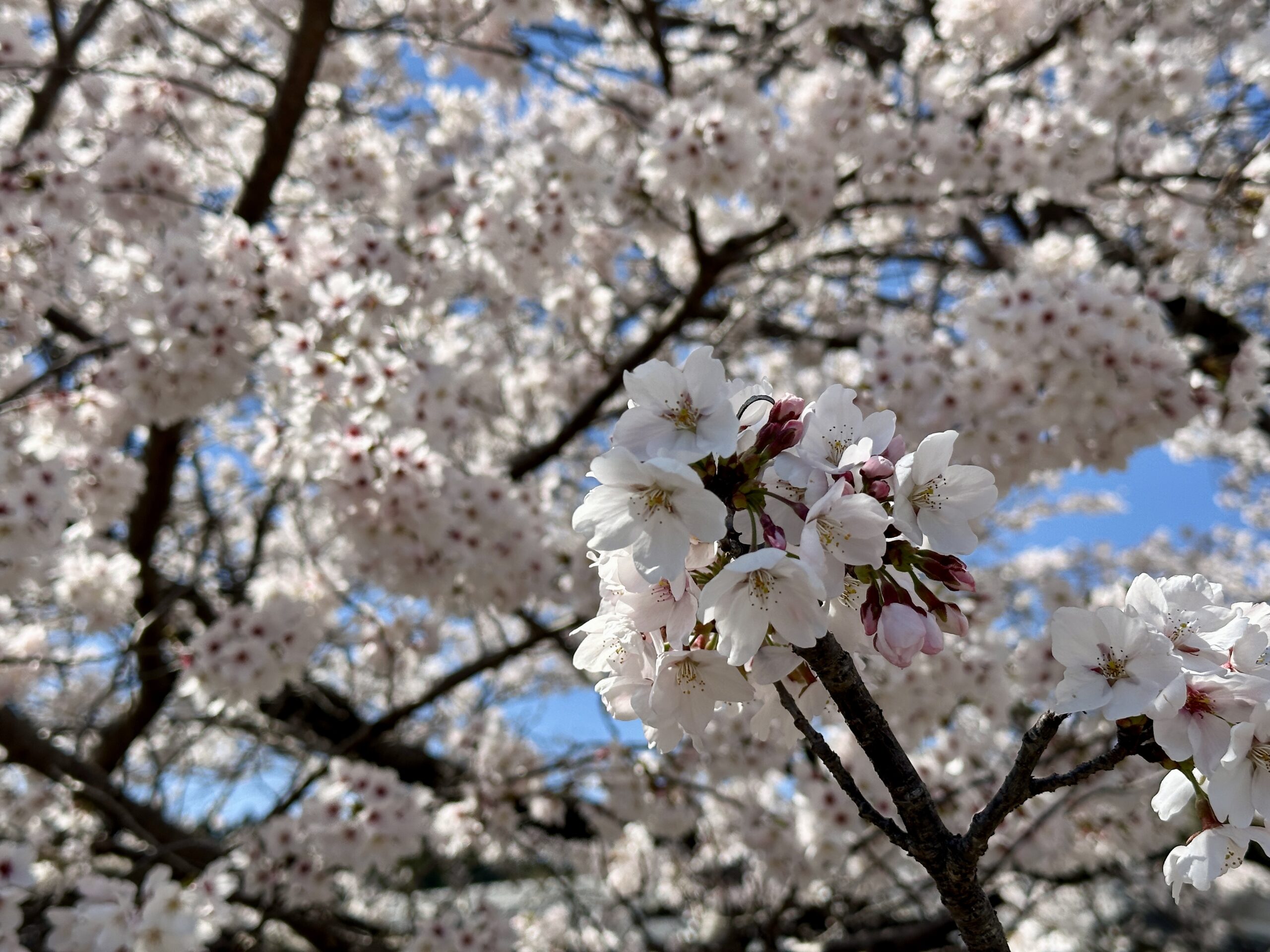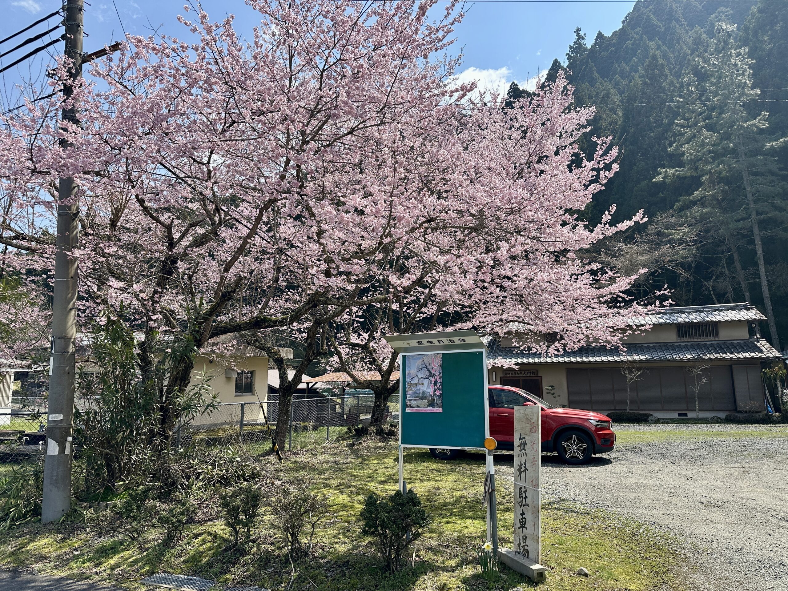桜まつりの期間中は近くの集会所の駐車場が無料開放されるのですが、駐車場の桜も満開でした。桜も隔年で花付きが変わるようで、今年は花付きが良く可憐な花が競うように咲いていました。