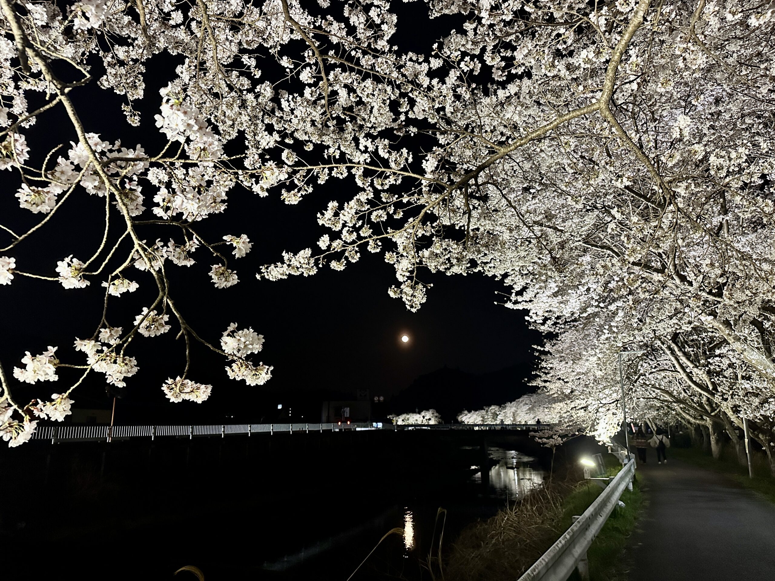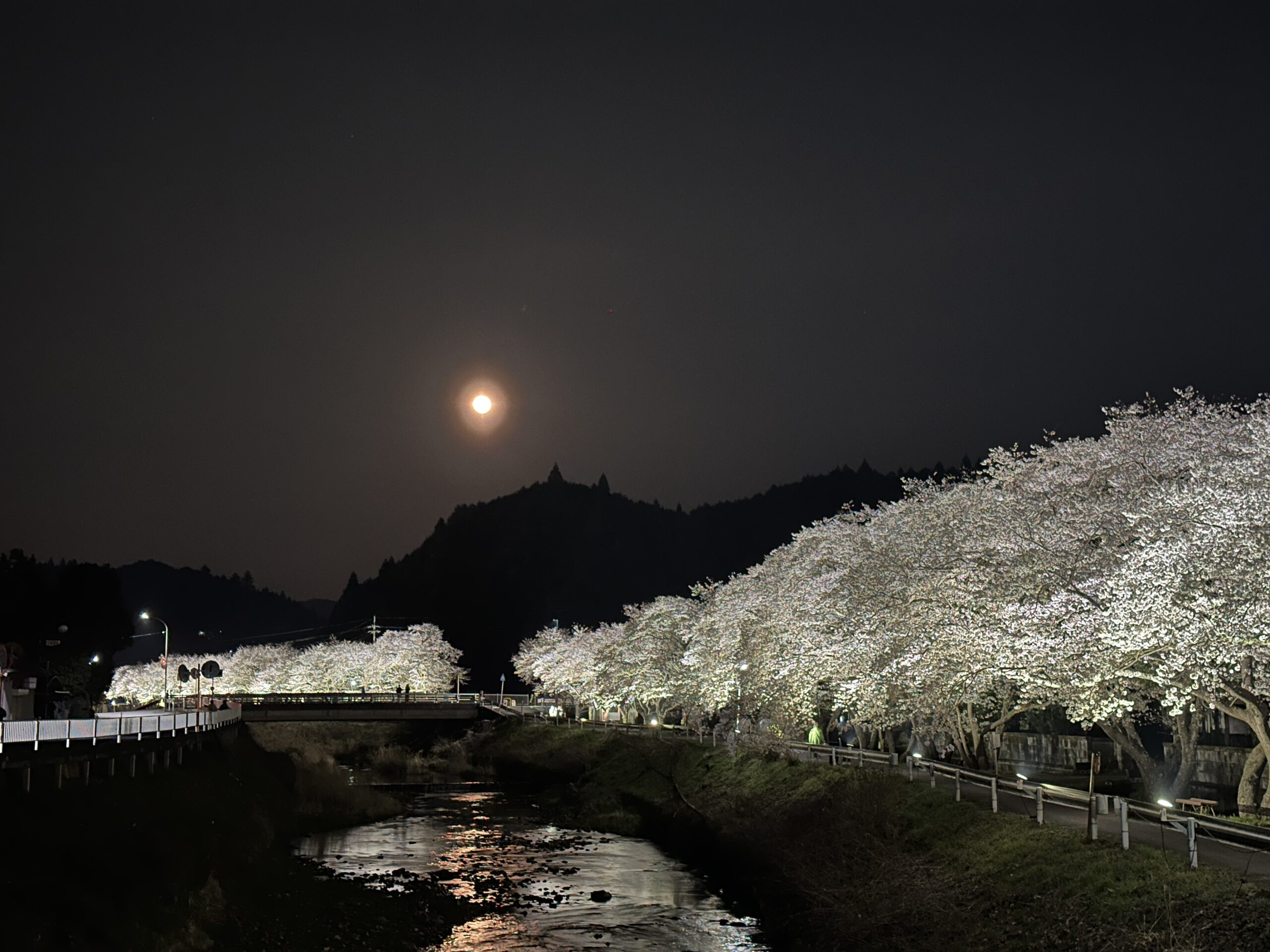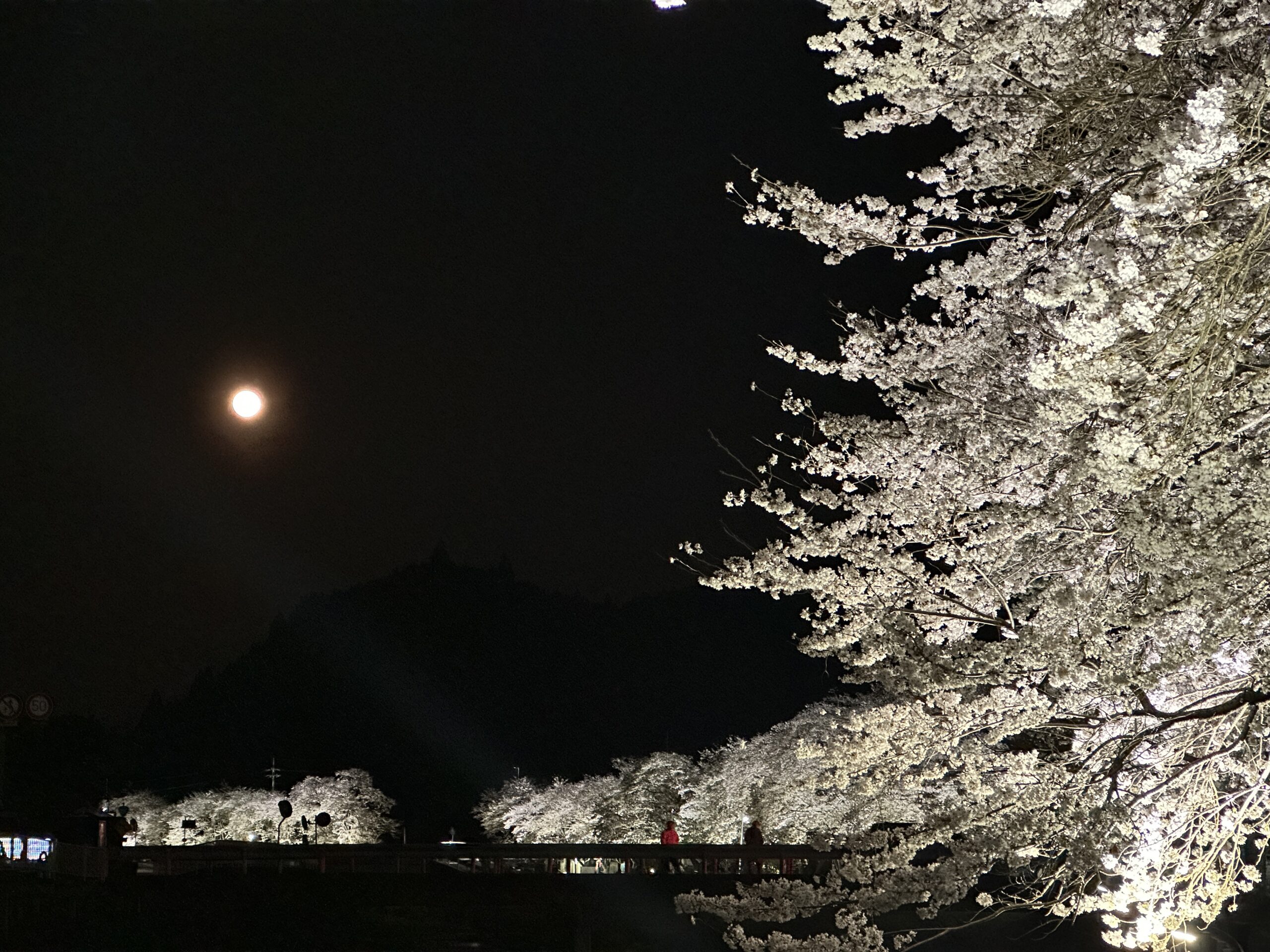 日中は何度か訪れたことのある水分桜。宇陀の夜桜見物は初めてです。満月が雫のように川面に映る幻想的な夜桜を楽しむ事ができました。