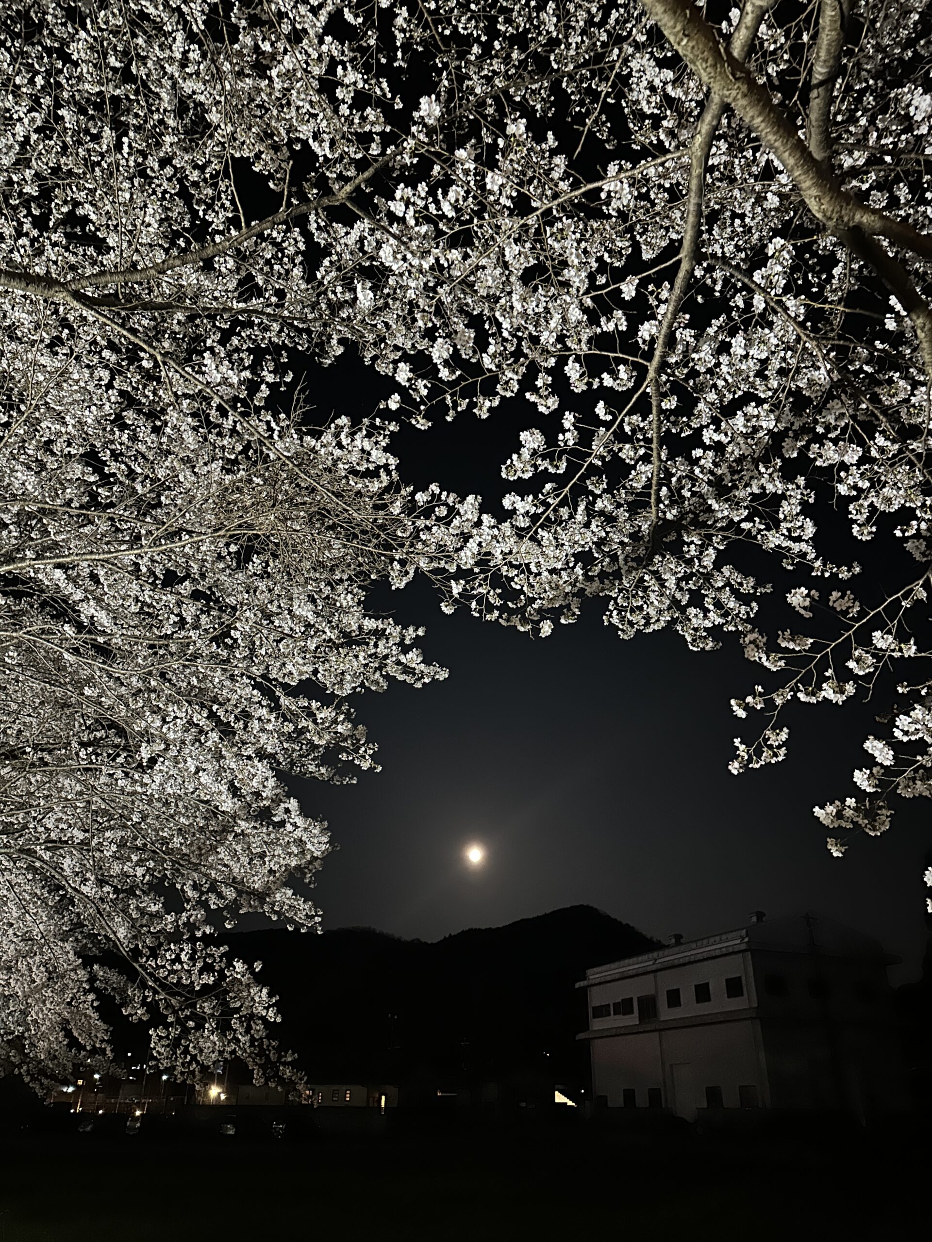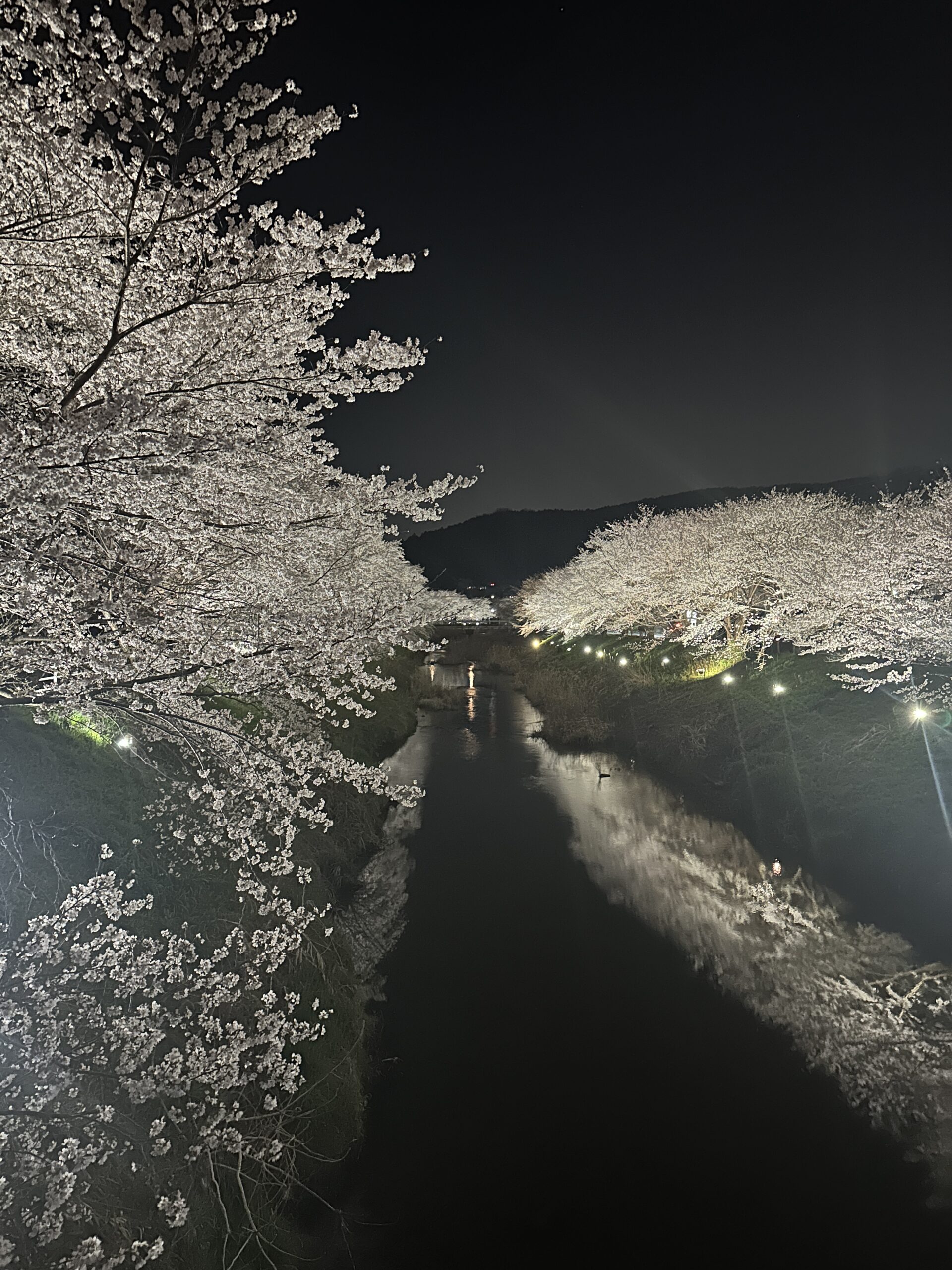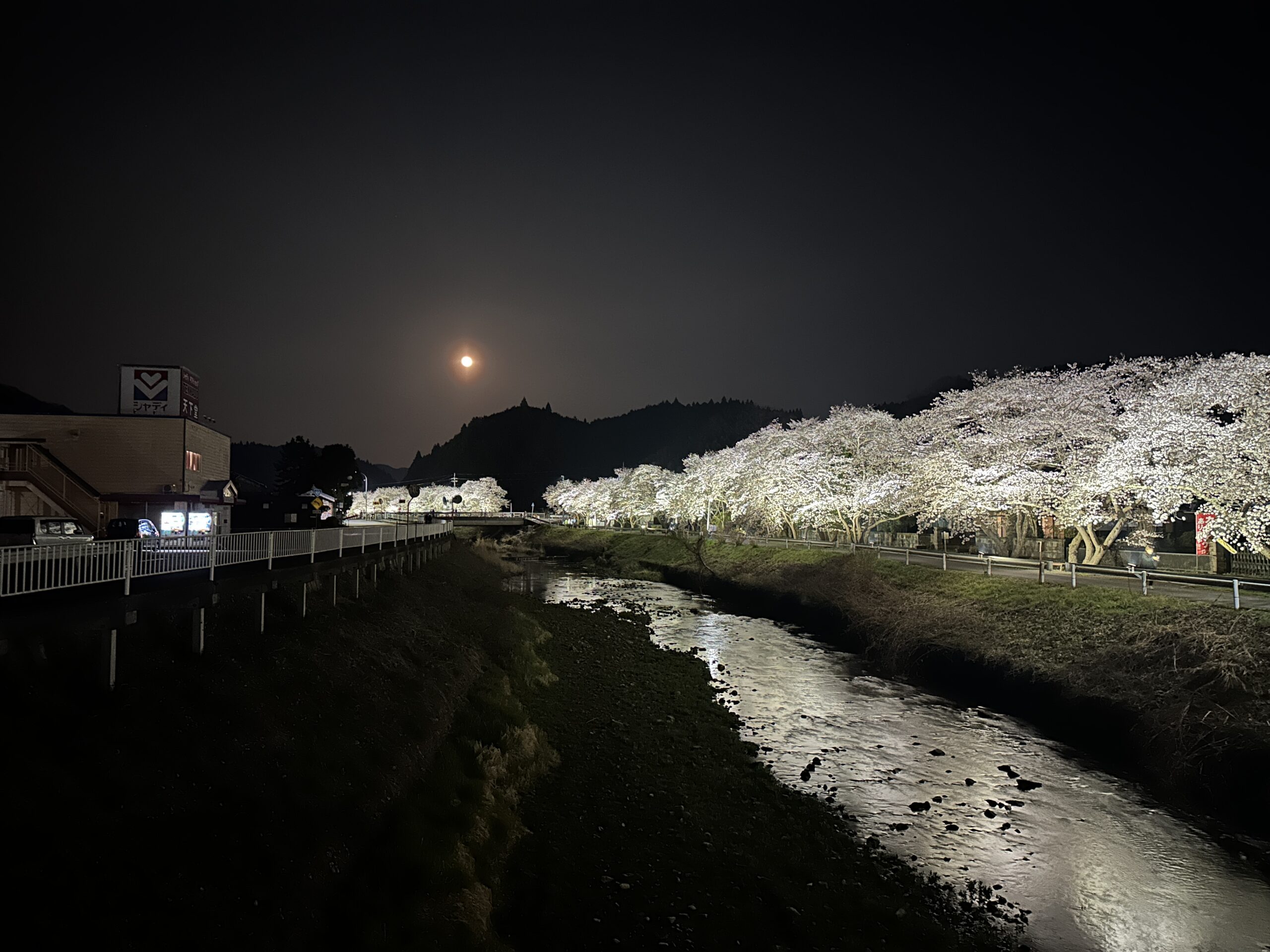 日中は何度か訪れたことのある水分桜。宇陀の夜桜見物は初めてです。満月が雫のように川面に映る幻想的な夜桜を楽しむ事ができました。